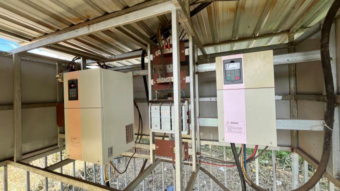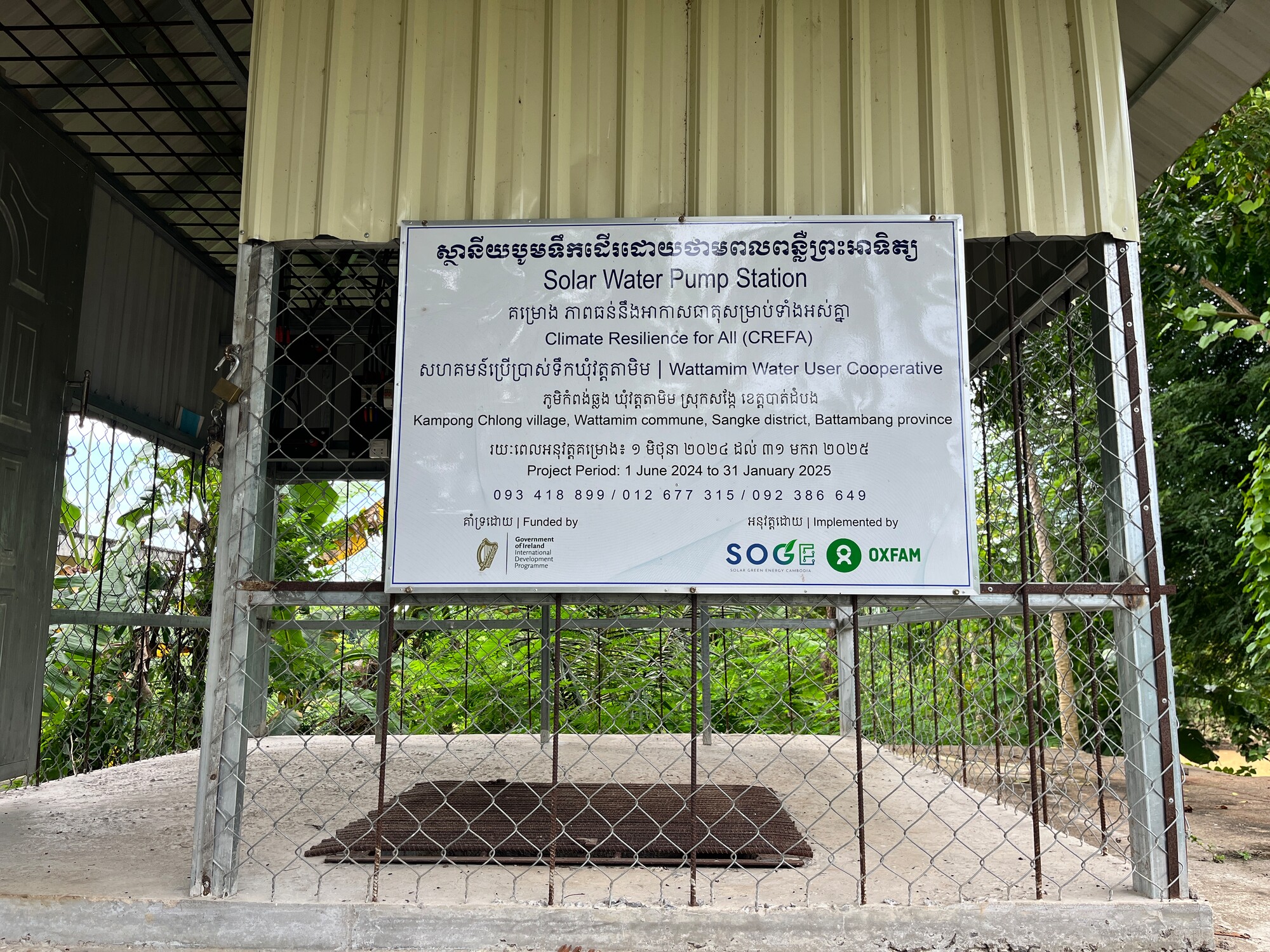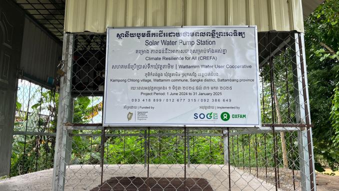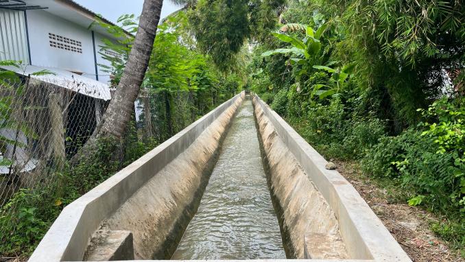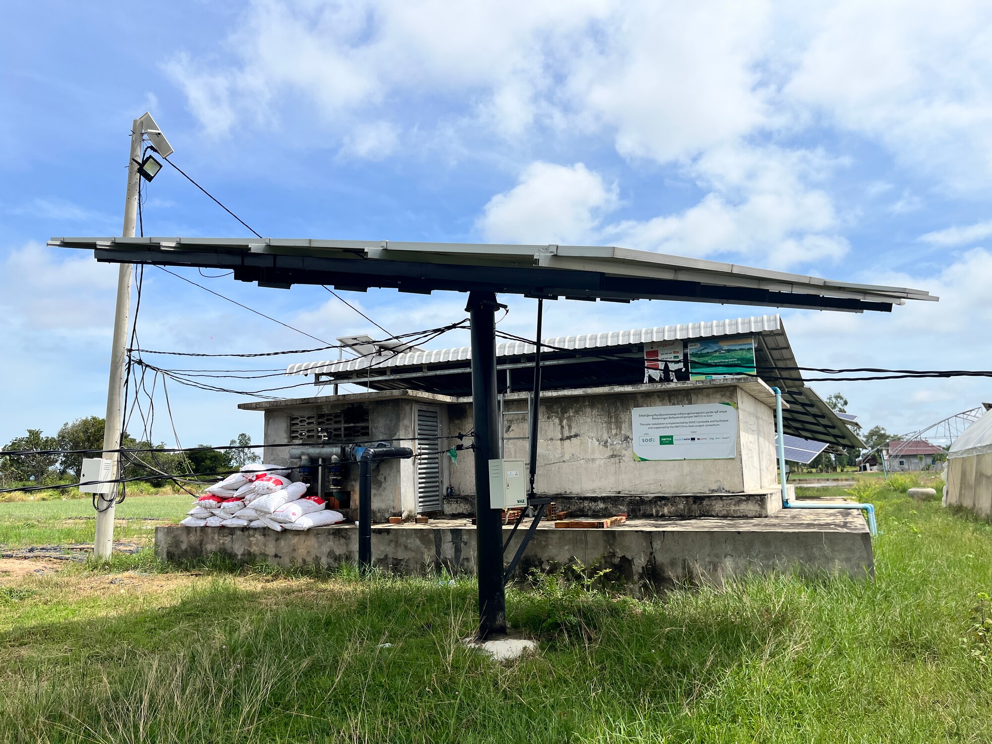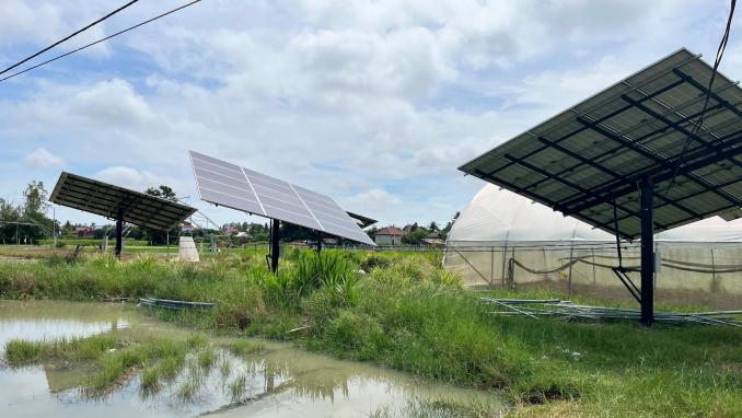 A few kilometers from the water pump station, solar panels line a reservoir that the commune hopes to use as a water source during droughts. Commune members say additional infrastructure investments are needed to make this possible. Photo by Vin Aranas/I-JET